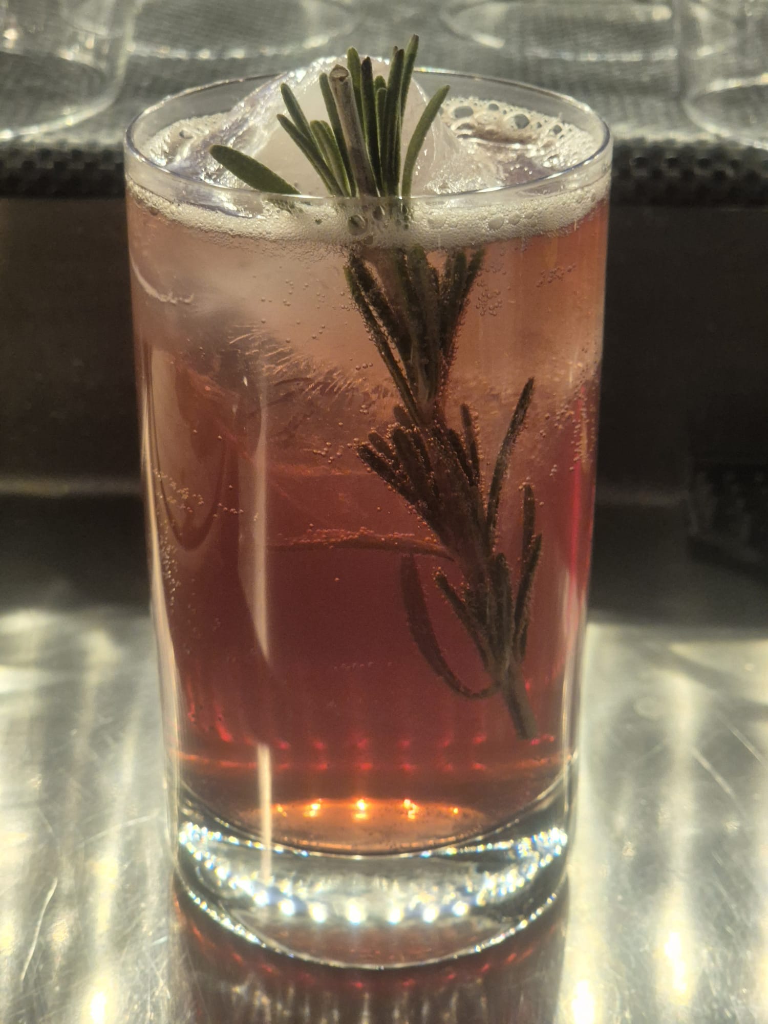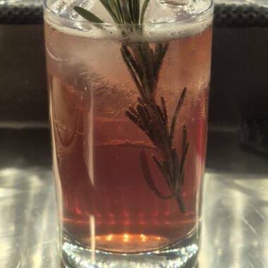 Ingredients: rosemary-infused Ezra Brooks 99 bourbon, Fuckoff Nightmare Wild Berry liqueur, San’Antonio di Paduva herbal liqueur, Wostok Plum & Cardamom lemonade, garnished with a fresh rosemary twig