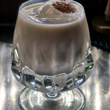 Ingredients: Rhizom Dry Gin, Underberg Espresso Herbtini, Lav’a Belle lavender aperitif, Fee Foam, garnished with a dehydrated rose bud