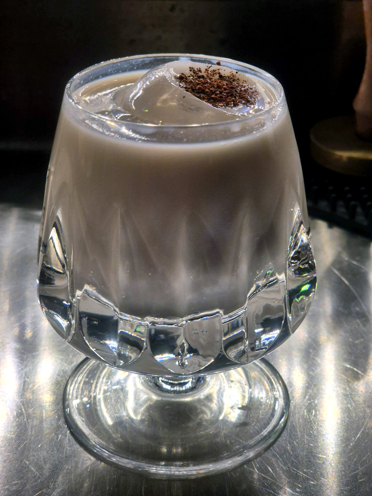 Ingredients: Sommerlink blueberry gin, 43 vegan horchata cream liqueur, Strega Crema cream liqueur, Zyankali absinthe, garnished with a sprinkle of grounded pomegranate