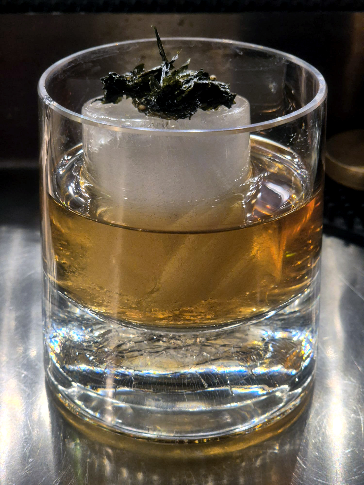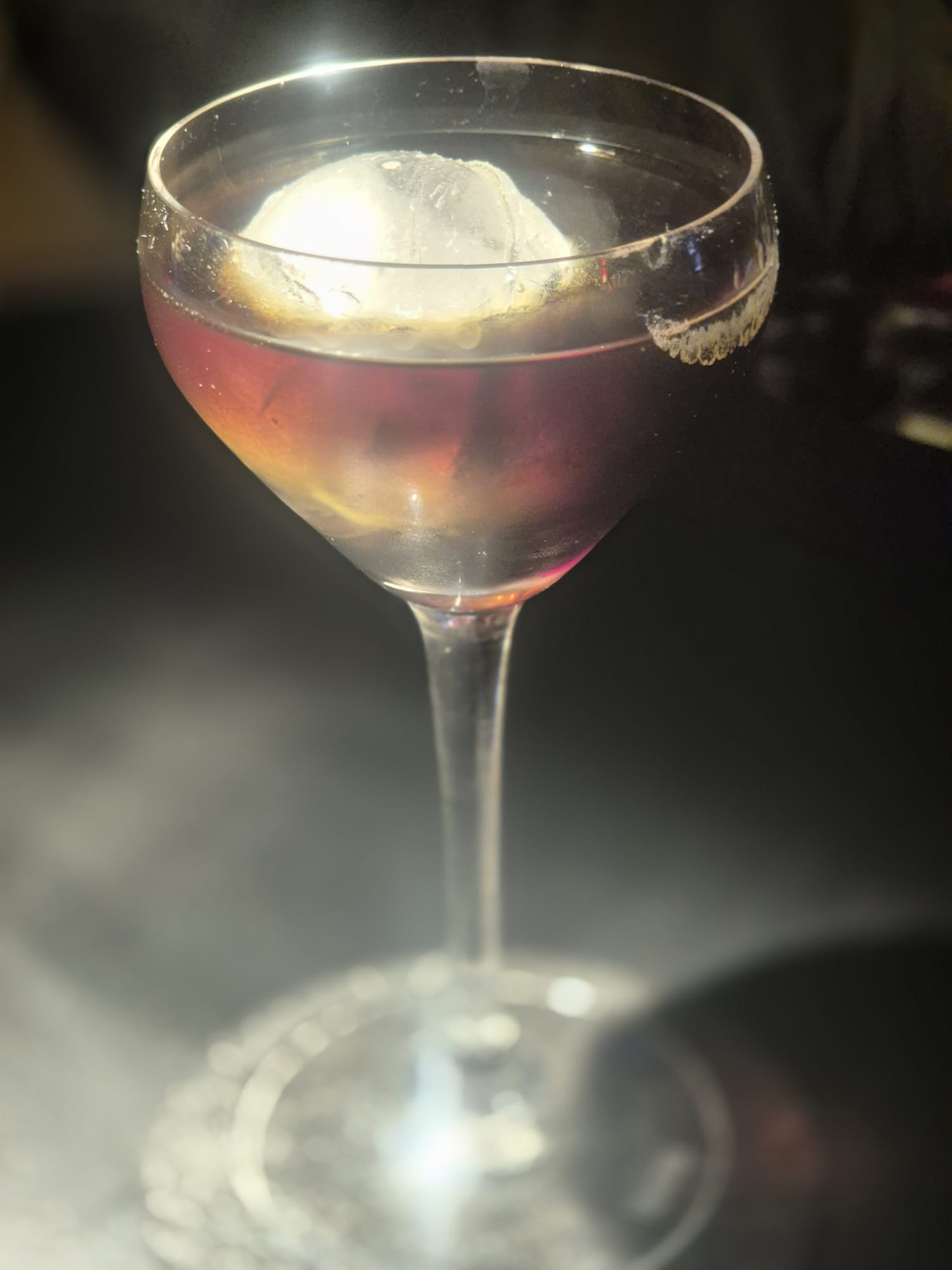Ingredients: Glen Moray Peated Whisky, Wild Turkey 101 Rye whisky, Punt E Mes bitter sweet vermouth, orange bitter, Angostura bitter, garnished with a Luxardo Maraschino cherry